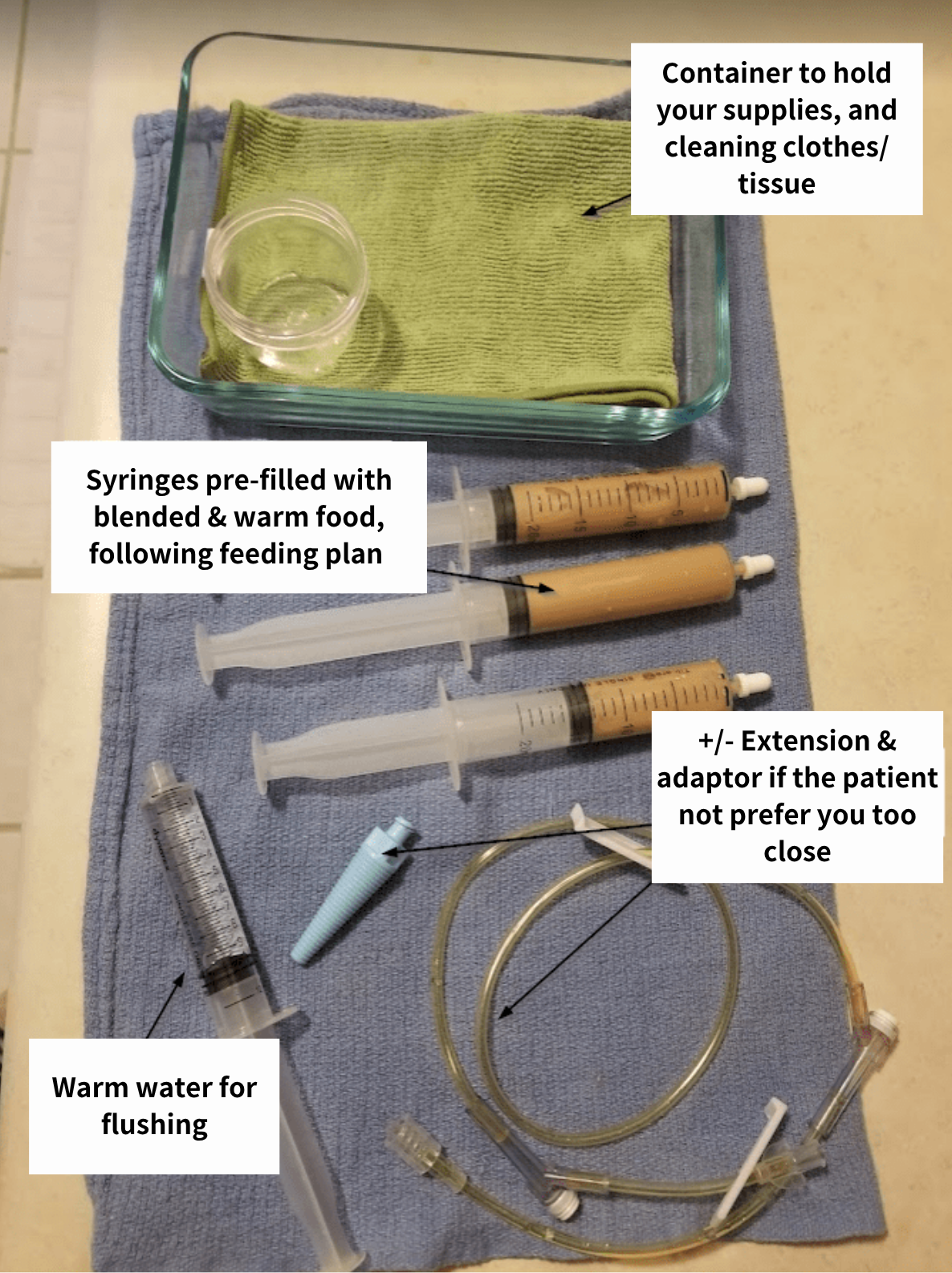 在餵食時,需要將患者的頭部抬高(高於肩膀),以避免反流(重力也有助食物到達適當位置)。首先,鬆開餵食喉夾子。慢慢給予溫暖的流質食物,讓胃部慢慢擴張。整個餵食過程歷時 5 至 10 分鐘。記得每次重新裝填充針筒及餵食結束時,都需要夾緊餵食喉。
