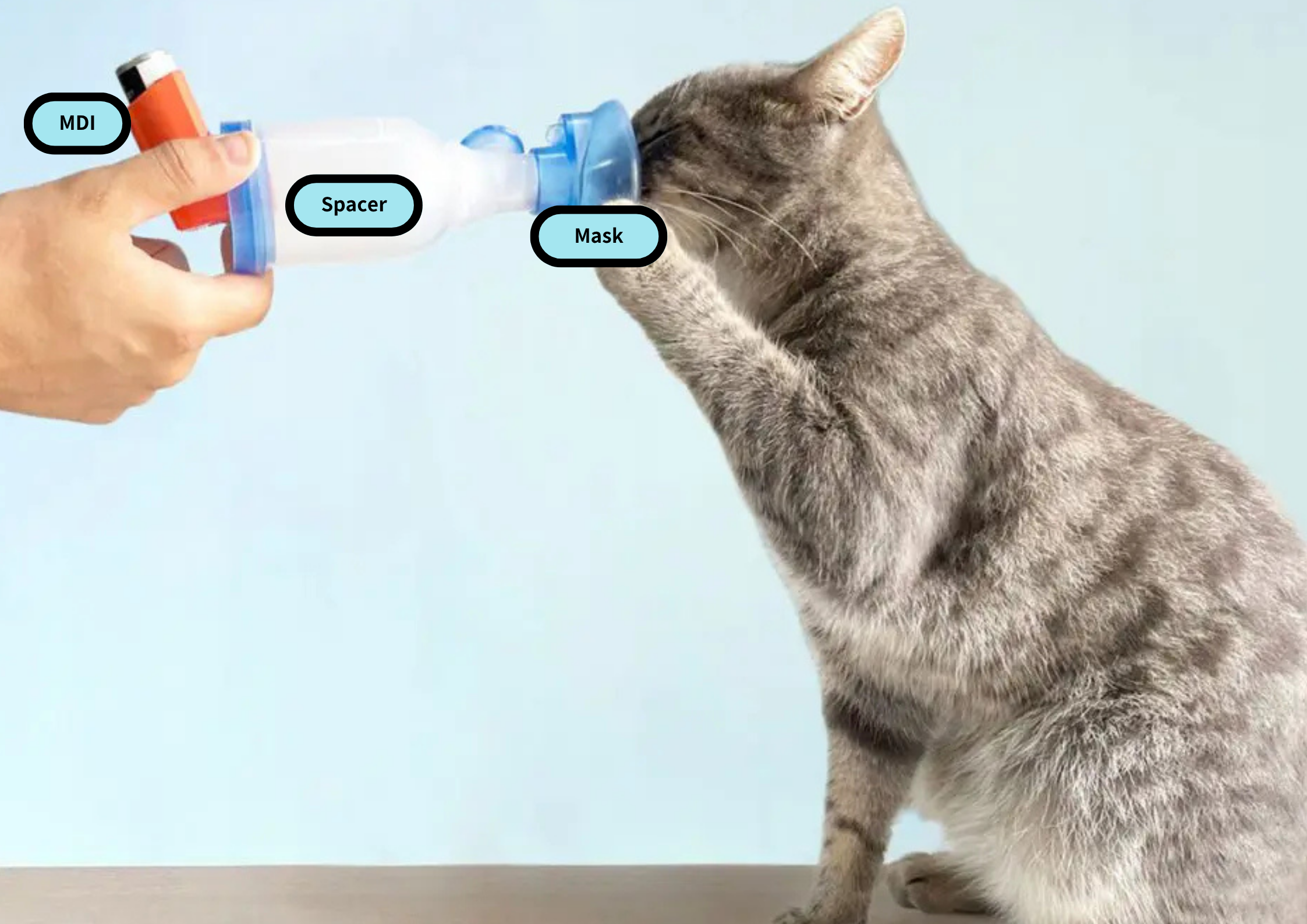 吸入式類固醇在減少貓哮喘氣管發炎方面也有顯著療效,可作為全身性療法的替代方案,與口服或注射類固醇相比,吸入式類固醇對內分泌和免疫副作用較少。吸入式需要配搭計量吸入器(MDI),搭配Spacer和面罩給藥。對於剛診斷、中度或嚴重受影響的喵喵,可能需要同時使用口服類固醇以等待吸入式發揮最大效果。 常用的吸入式類固醇包括Fluticasone Propionate(Flixotide)、Flunisolide、 Beclomethasone Dipropionate。