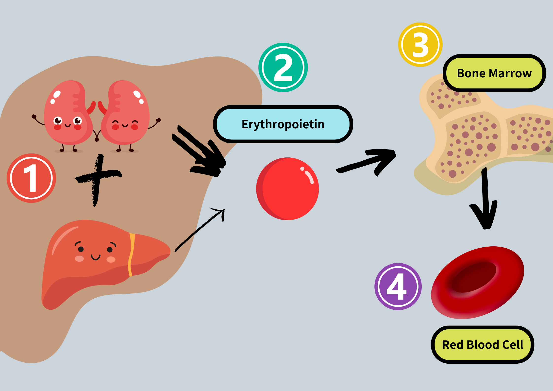 當身體失去紅血球時,便會出現「需要更多紅血球」的訊息。此時,一種被稱為「促進紅血球生成素」(Erythropoietin)的激素就會產生。這種激素會指示骨髓(Bone Marrow)增加紅血球的產量和釋放,以便身體可以適當地應對失血的情況。當身體出現更多的 Erythropoietin 時便意味著身體會出現更多的紅血球,即可以攜帶更多的氧氣。Erythropoietin 的作用持續大約一天,但其效果要在大約五天後才能看到,因為在骨髓中新生的紅血球必需要成熟到一定情度才會被釋放到循環系統中。
